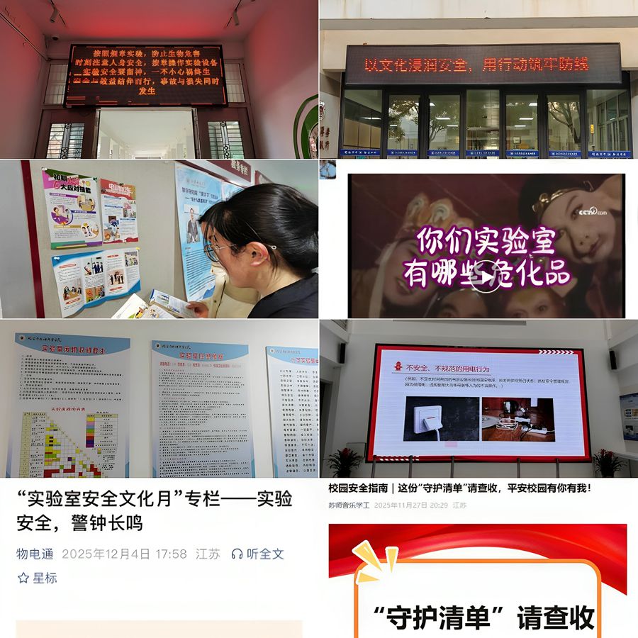 多维覆盖,营造浓厚氛围。活动整合多元宣传资源,构建全方位宣传矩阵。实验室楼内设置安全知识展板、海报,校园电子屏滚动播放安全警示,各学院官方公众号持续推送安全操作指南、典型事故警示案例、安全小贴士等内容。多渠道的宣传推送,让安全理念随处可见、入脑入心,营造“人人讲安全、事事为安全、时时想安全、处处要安全”的校园氛围。